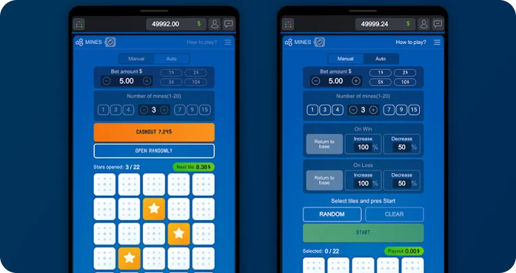 Placez votre mise et sélectionnez le nombre de mines sur la grille. Plus il y a de mines, plus vos gains sont rapides.